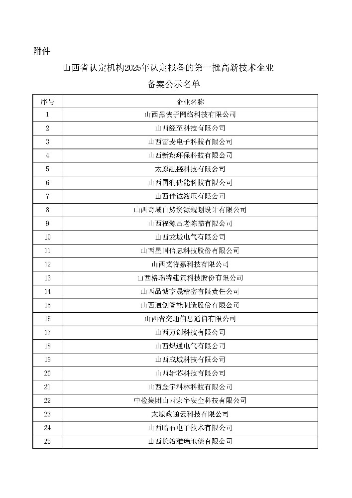 附件:山西省认定机构2025年认定报备的第一批高新技术企业备案公示名单