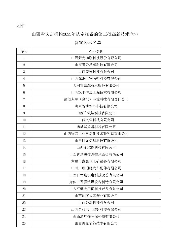 附件:山西省认定机构2025年认定报备的第三批高新技术企业备案公示名单